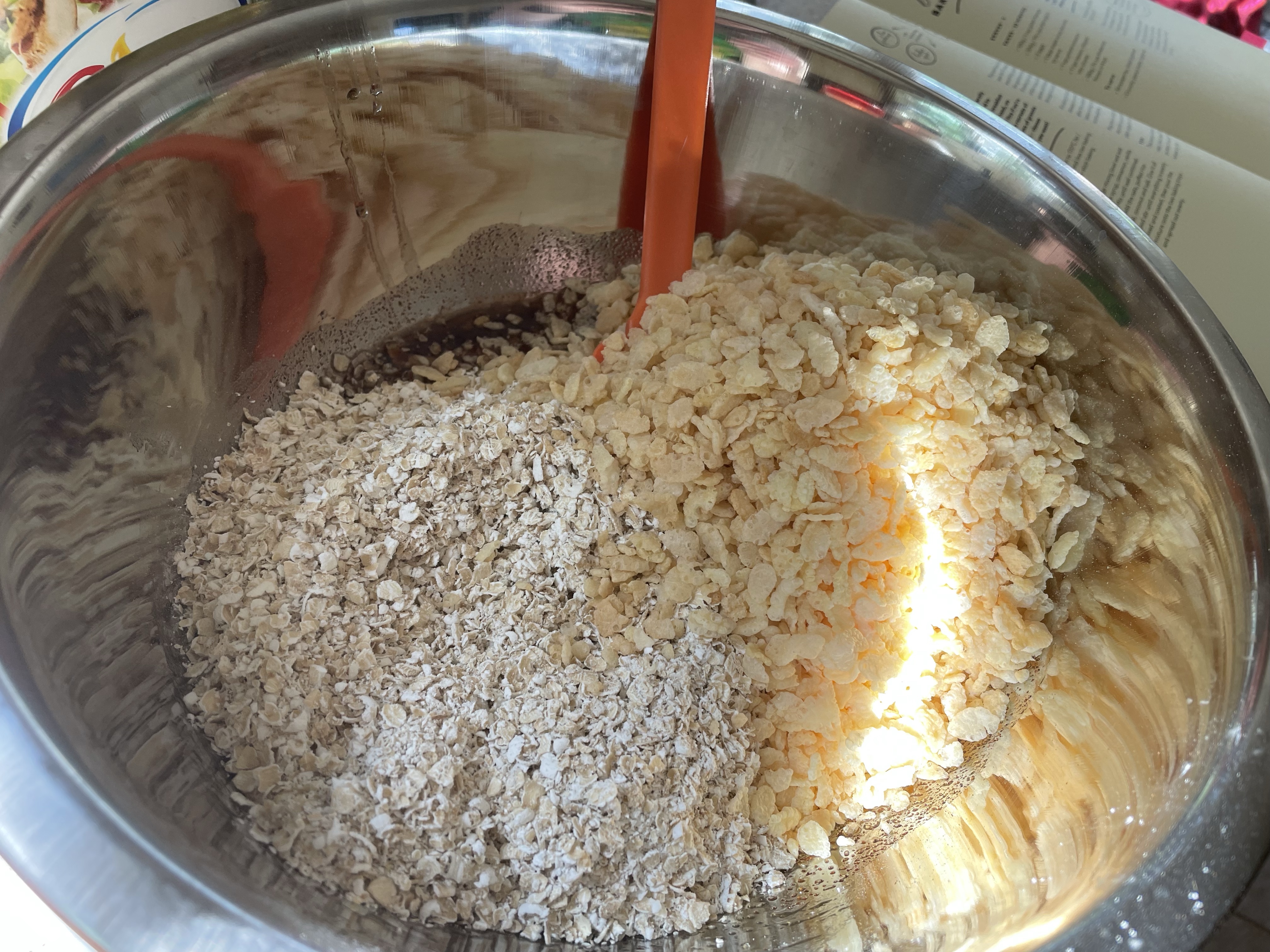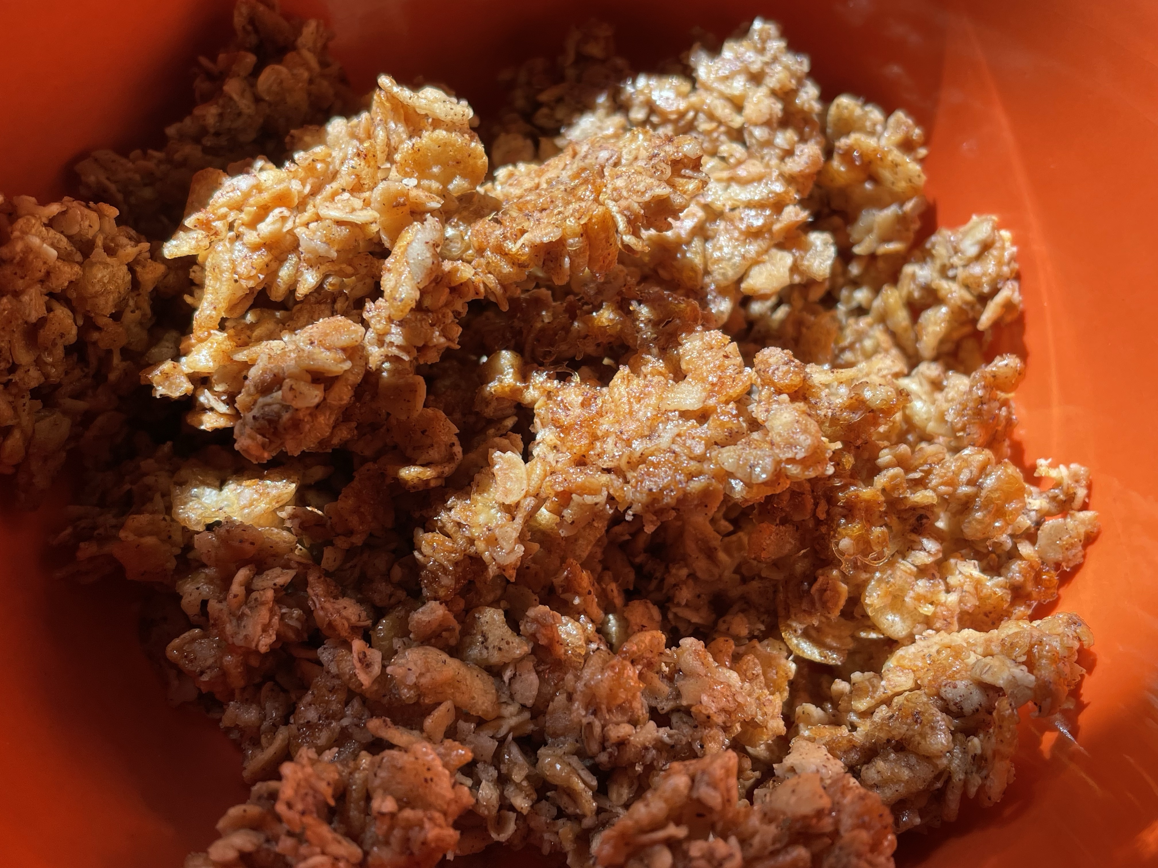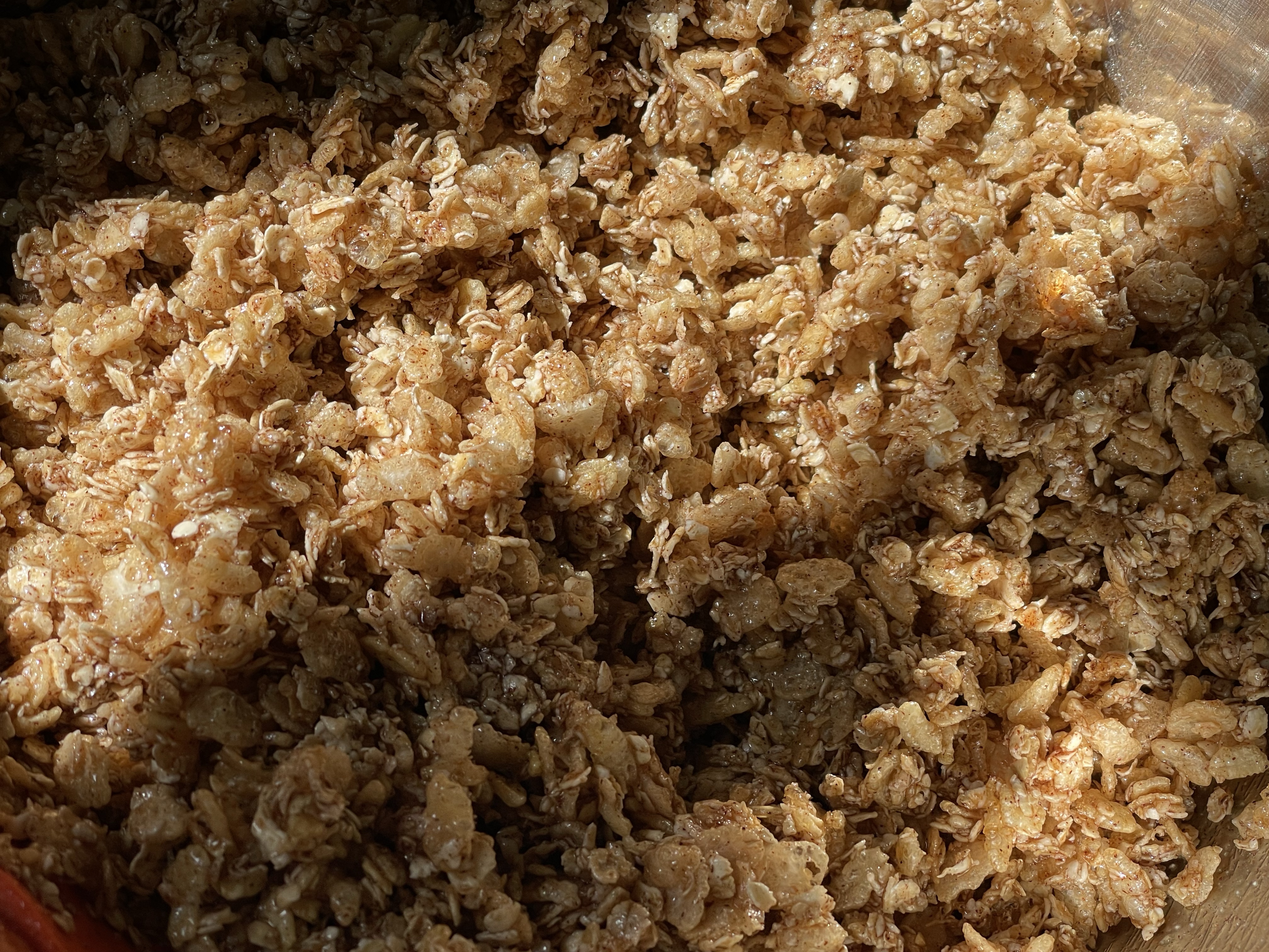 Since I subbed that, I only used 75g instead of 100 since it is way lighter. I also left out the coconut flakes and used 2 tsp of cinnamon instead of 1… because it’s me. 😂