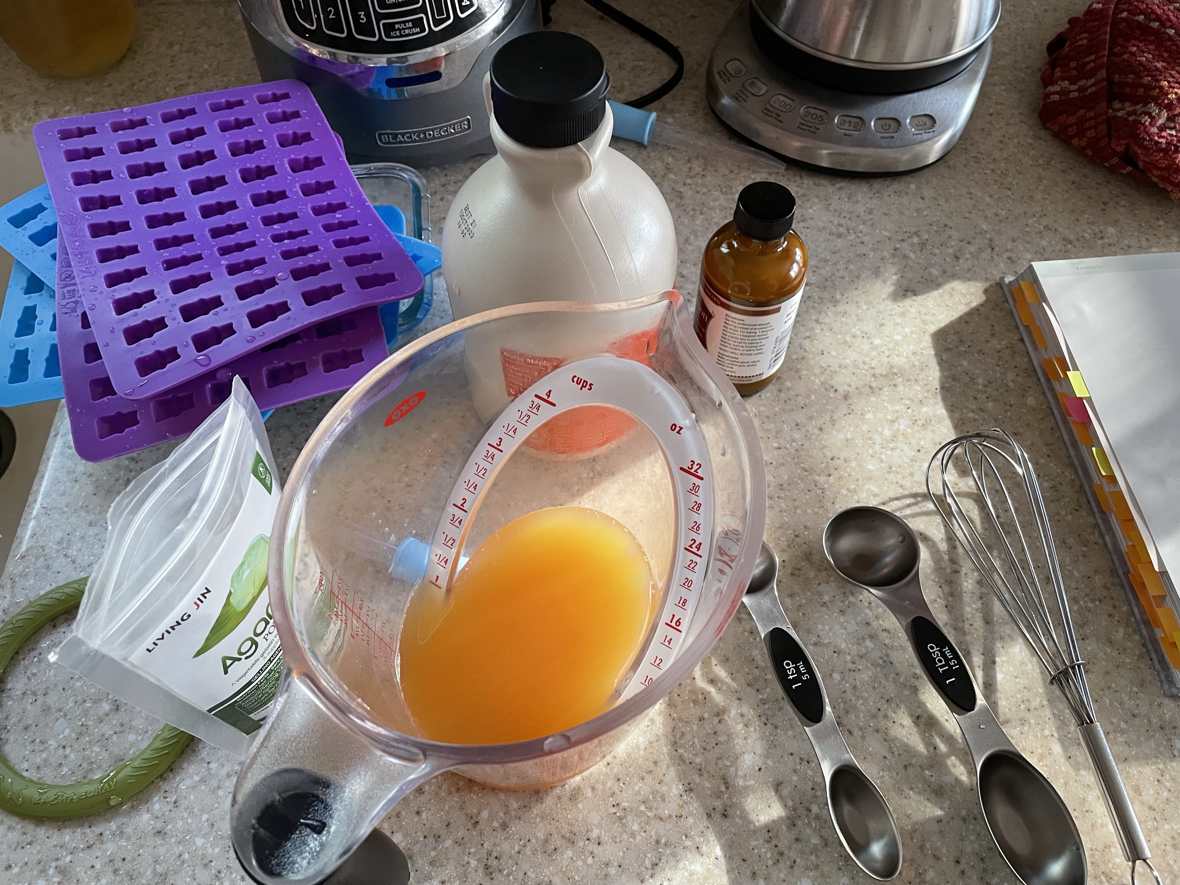 Full honesty, I had to make this one twice because I missed the “tips” note on the second page entirely and in this case gelatin to Agar Agar is not 1-to-1. As I was making it, I tried saving it by continuing to add more liquid, but I knew something had to be wrong and I was right.