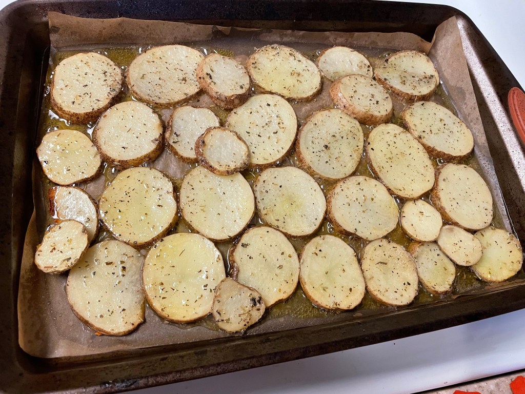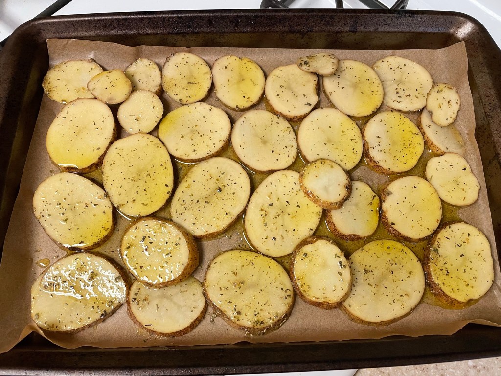 I put the spices in a bowl and added the olive oil and coated each slice individually rather than brushing it on. Next time I’d use less oil then written and potentially slice a bit thinner and cook for a little longer to crisp them up. I’m thinking “broil” for a few minutes after adding whatever toppings you were loading on.