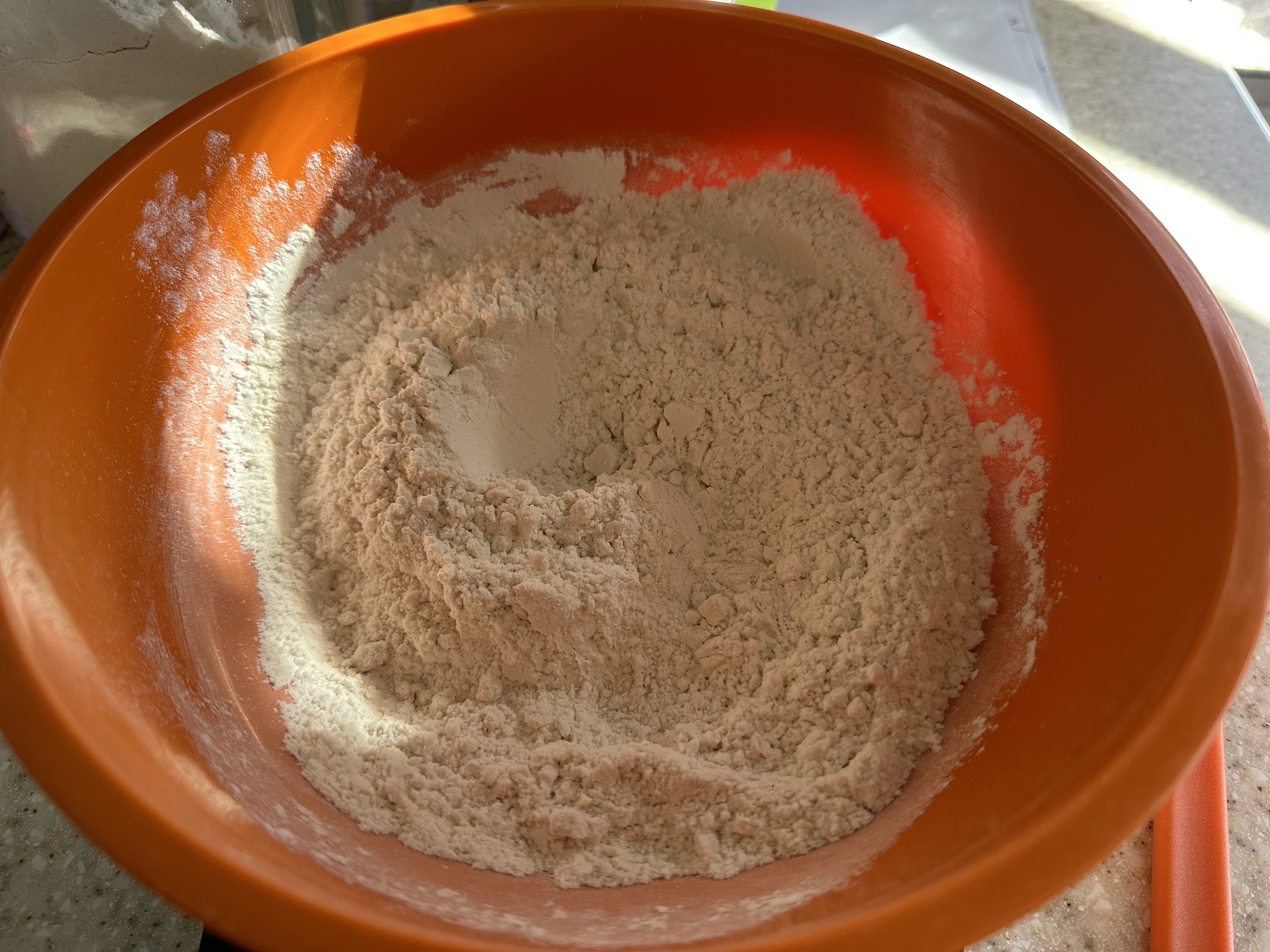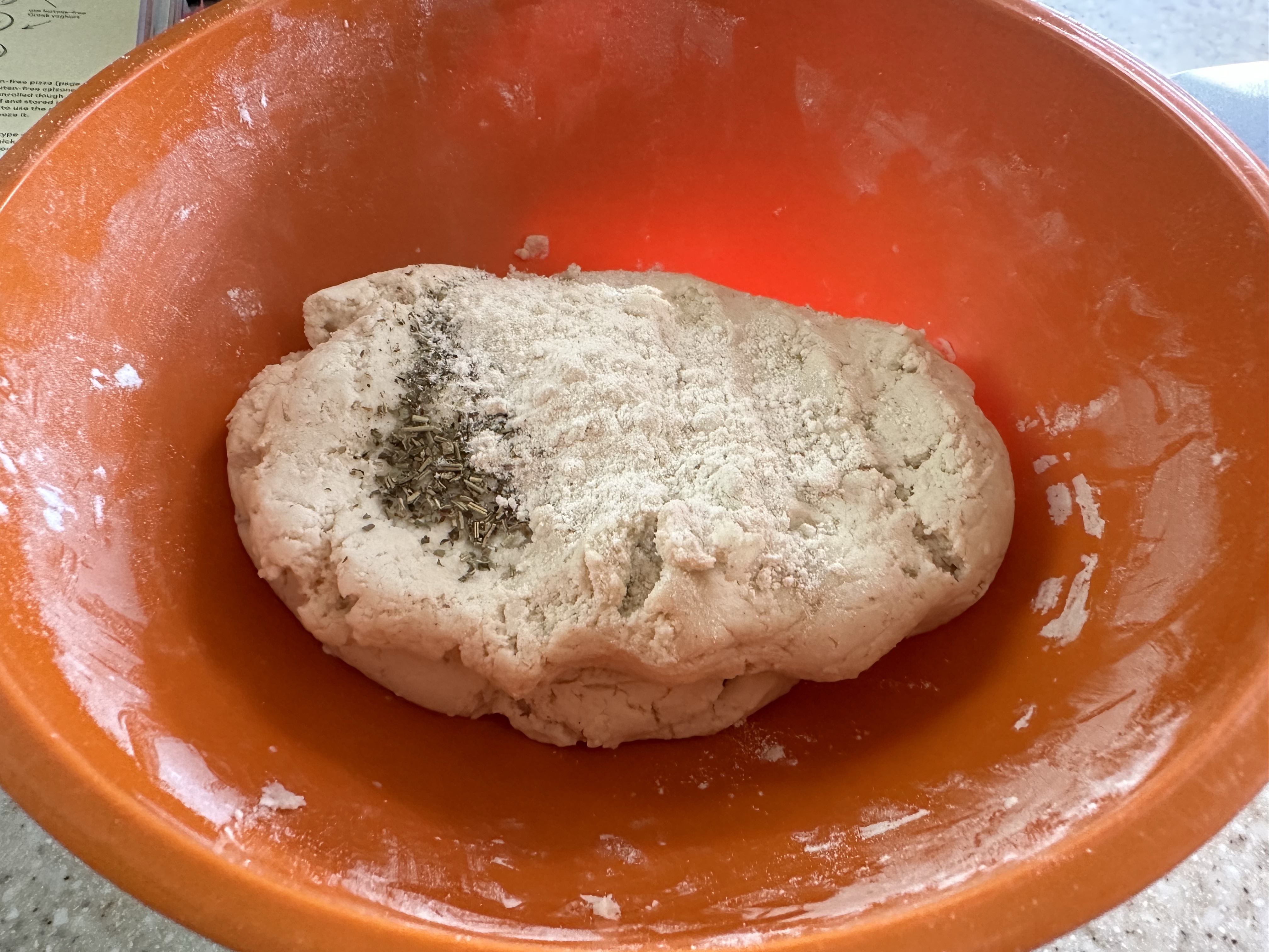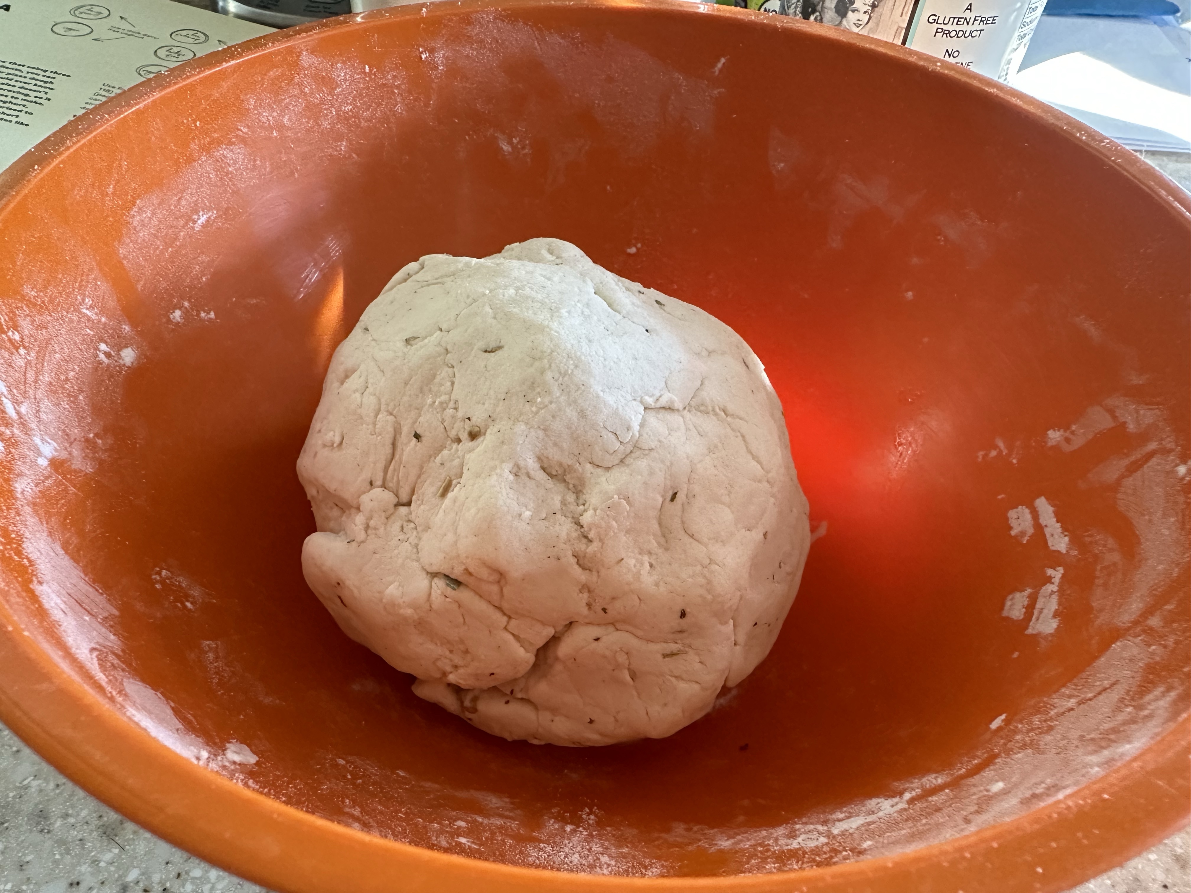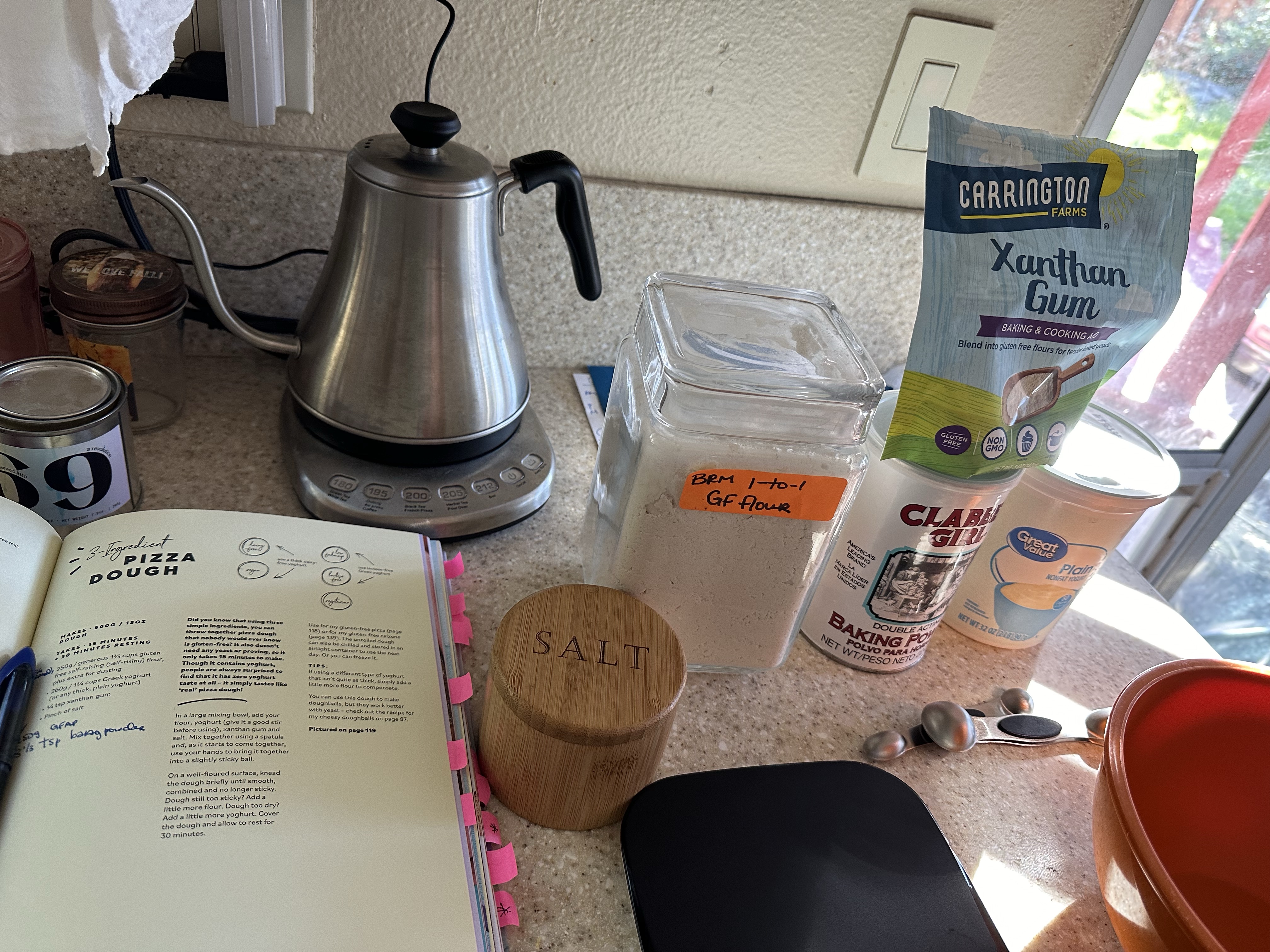 That said, for Sunday Night Dinner yesterday, I opted for a new recipe instead of going with the old staple GF pizza dough recipe. This one from the “How to Make Anything Gluten Free” cookbook from Becky Excell. I don’t typically use yogurt in my recipes, but with her recipe, it’d be great for pizza dough in a pinch because no rise time is needed.